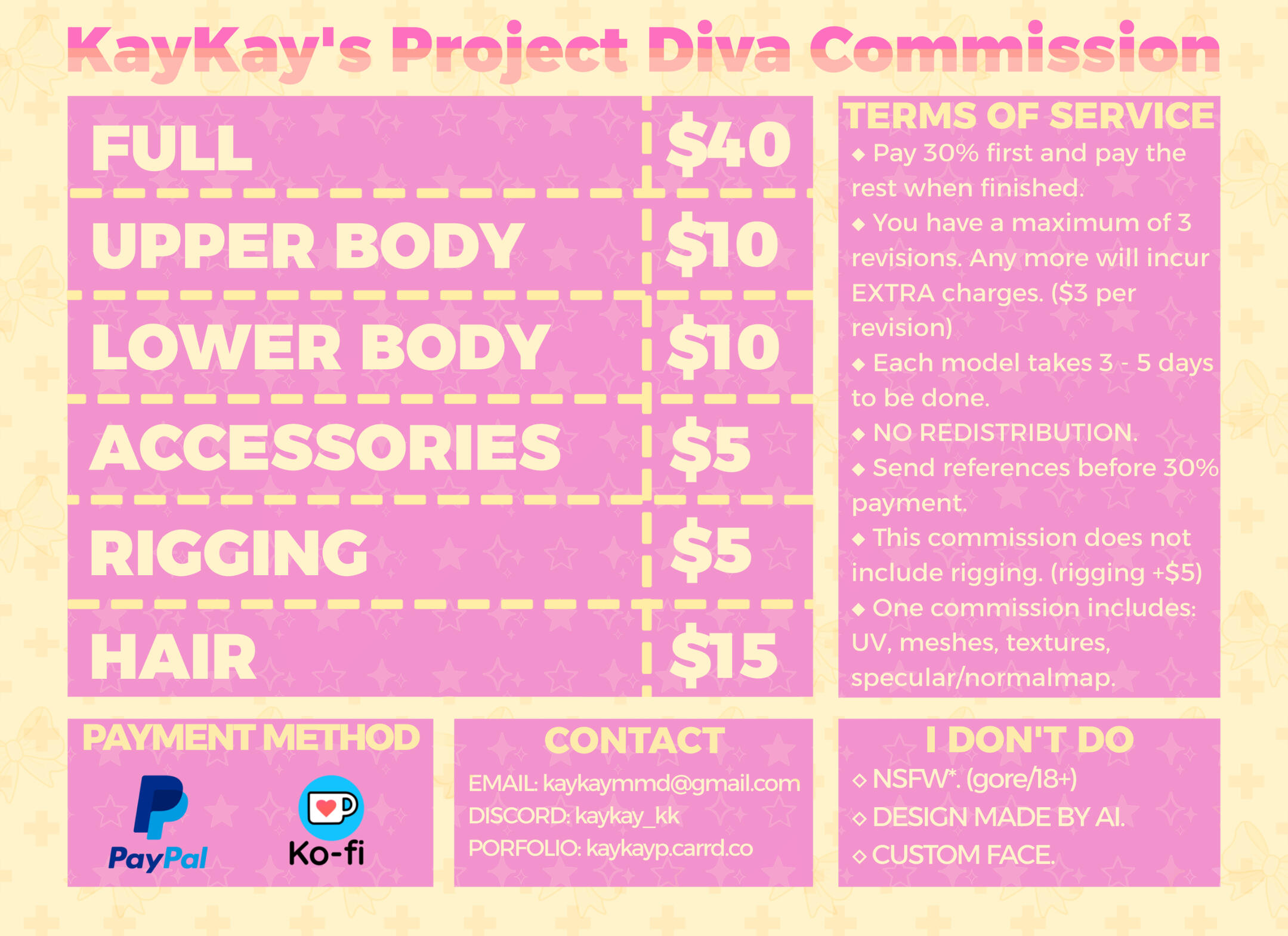 I'm KayKay you can call me KK or whatever. I am 16 years old. I've been making 3D since 2019. I also like drawing, listening to music and I'm a fan of Taylor, Ariana. I do commission, information of commission is in commission tab.